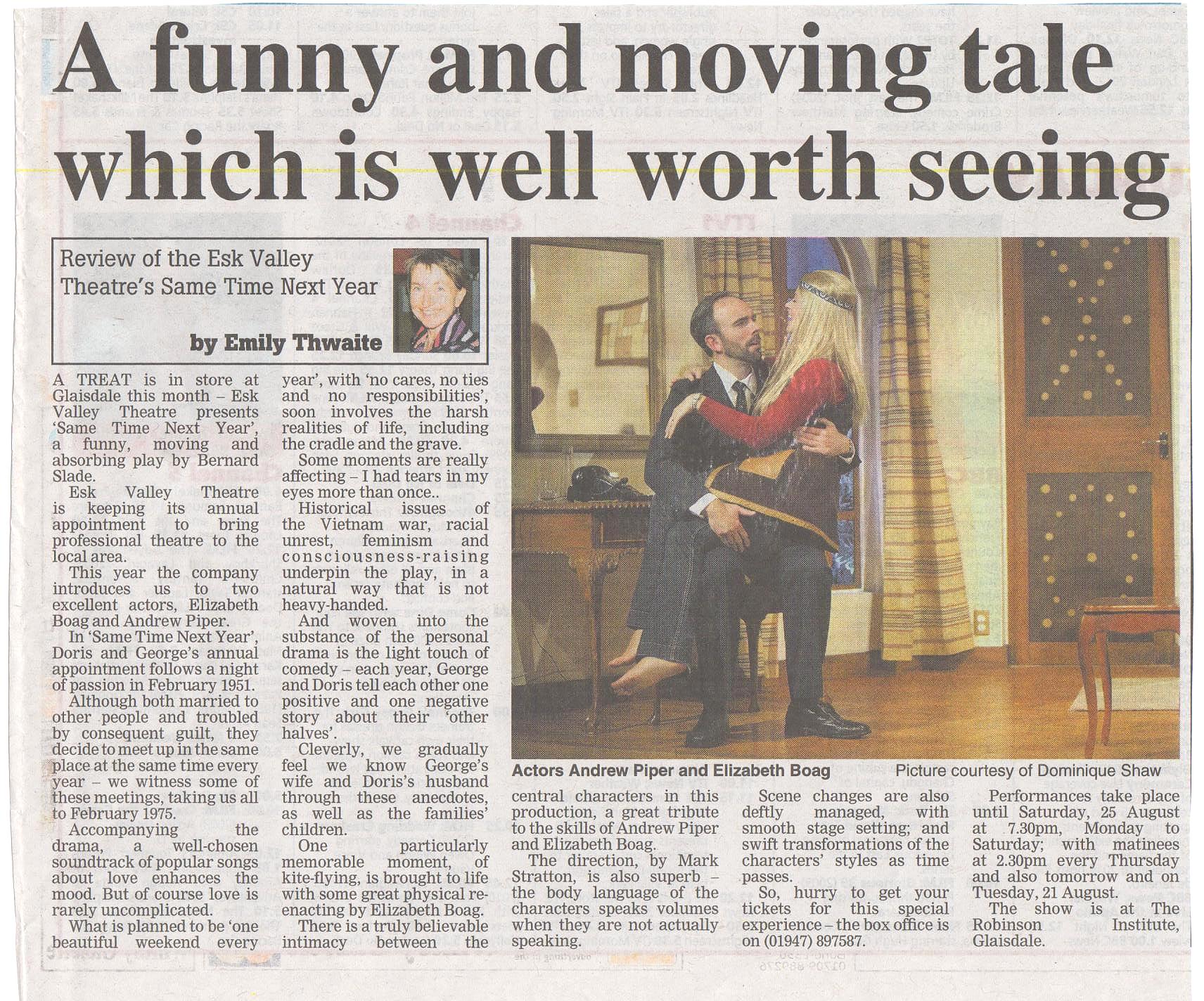 Same Time Next Year is the best production thus far from Esk Valley Theatre, marking a significant raising of already excellent standards. There is integrity and understated emotional power in the playing and it is funny where so many American plays from that period have become unfunny. The humour is not slick, it is character driven and in the most heartening fashion.